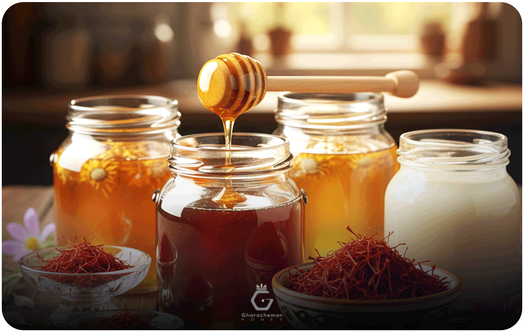 عسل زعفران نادر است و از ترکیب شهد گلهای زعفران (Crocus sativus) با عسل طبیعی در مزارع خراسان تولید میشود. این فرآیند دستی است و قیمت آن بالا است. رنگ طلایی و عطر معطر آن برجسته است.